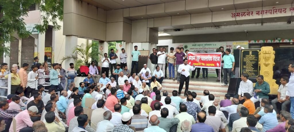 अमळनेर शहर व्यवसायिकांची गेल्या 27 वर्षापासून संघटना आहे. त्याचे अध्यक्ष प्रा. अशोक पवार असून सेक्रेटरी पदमेश सोनवणे आहे व शिवाय अन्य पदाधिकारी व कार्यकारणी सदस्य आहेत. संघटनेने वेळोवेळी दहा हजार रुपये भरलेल्या दुकानदारांना दुकाने द्या व दुसरा हप्ता कधी भरायचा ते सांगा. असे न प ला सांगितले आहे. न प अमळनेरने 123 मध्ये आत्ता बांधकाम केले .परंतु अतिक्रमण धारकांना दिलेल्या लेखी पत्रांचा, ठरावांचा व टेंडर फॉर्म सोबत दहा हजार रुपये भरले यांचा विचार अद्याप नगरपरिषद अमळनेर ने का केला नाही हा आमचा प्रश्न आहे. त्यामुळे अंमळनेर शहर व्यावसायिक संघटना आंदोलनाचा मार्ग स्वीकारत आहे. दिनांक 20 मे 2025 च्या मोर्चाने आंदोलनाला सुरुवात झाली आहे.