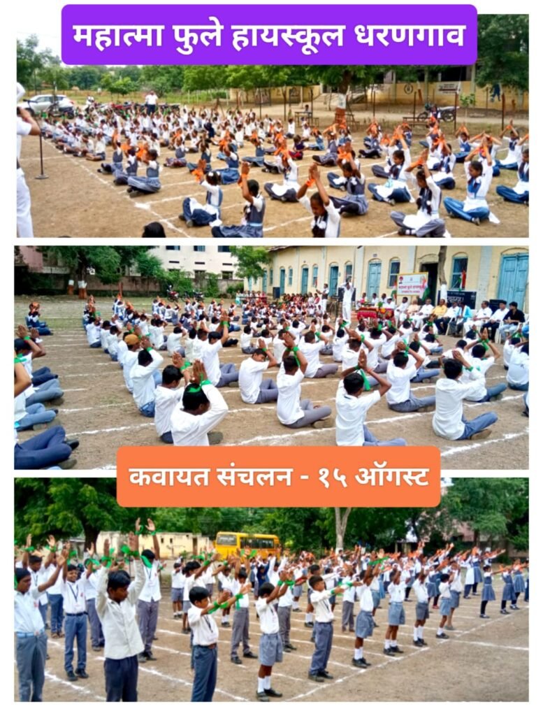 धरणगांव – शहरातील सुवर्ण महोत्सवी शाळा महात्मा फुले हायस्कूल धरणगाव येथे ७९ वा स्वातंत्र्य दिन व बक्षिस वितरण समारोह मोठ्या उत्साहात साजरा करण्यात आला. एस.एस.सी.बोर्डाच्या परीक्षेत शाळेतून प्रथम आलेली विद्यार्थिनी नंदिनी भोई हिच्या हस्ते ध्वजारोहण करण्यात आले. समारोहाचे प्रस्ताविक शाळेचे मुख्याध्यापक जे एस पवार यांनी केले.